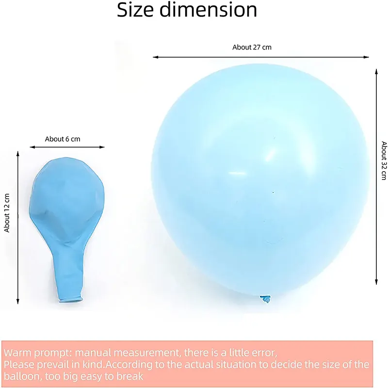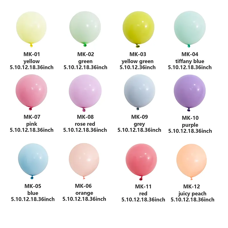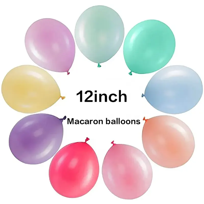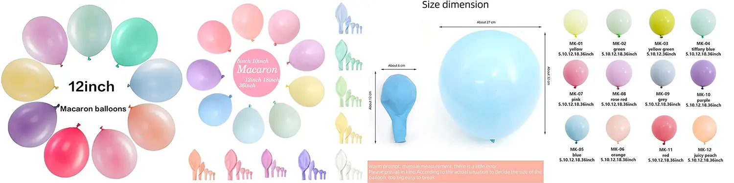 Барвисті: Використання технології змішування вдосконалених кольорових кольорових пасти, науково відновлюйте кольори макаронів - небо -синій, дитячий рожевий, кремовий жовтий, легкий зелений трава та десятки інших м'яких і барвистих кольорів, колір між партіями є дуже послідовним, що забезпечує надійне забезпечення якості для придбаних вами повітряних кульок.
