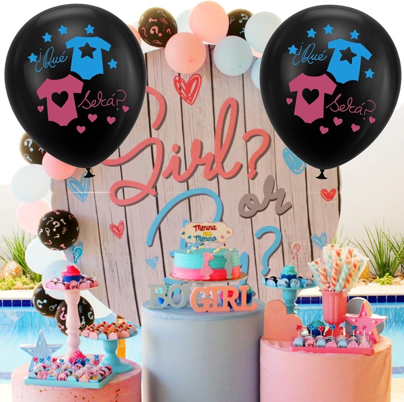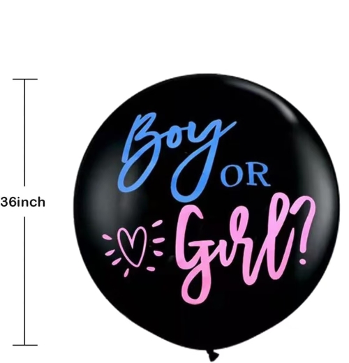 Для36-дюймова повітряна куля для виявлення статів наявності, це матовий чорний колір і має багато стилів друку, як-от хлопчик чи дівчинка, зображення персонажів хлопчика та дівчинки чи щось інше, пов’язане з хлопчиком та дівчинкою. Для конфетті один мішок — рожеве паперове конфетті з фольгою золотого кольору, інший мішок — блакитне паперове конфетті з фольгою золотого кольору.