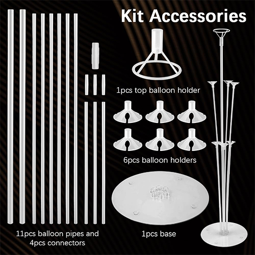 Підставка для підлоги на повітряній кулі складається з основи, декількох чашок, пластикових труб різної довжини, стиків та верхнього газового клубу. Після складання повітряна куля можна зафіксувати, щоб створити модель декору на робочому столі або наземній кулі, що підходить для вечірки, весілля, святкування та інших сцен сцен. Повітряна підставка зручно побудувати тривимірний і красивий костюм на повітряній кулі.