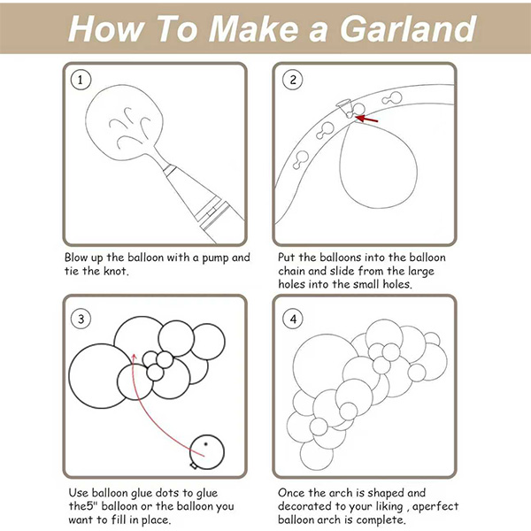 Увага та попередження:Будь ласка, НЕ переповнюйте повітряні кулі, а також уникайте сонячних опіків, перегріву, гострих предметів і надмірного тертя. Контролюйте кількість повітря, що надувається в кожну повітряну кульку, щоб досягти ідеального розміру повітряної кулі, насолоджуйтесь вечіркою з арками з гірляндами з повітряних куль.