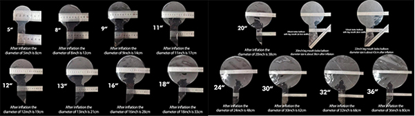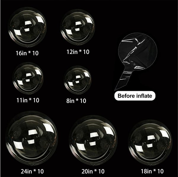Прозорі повітряні кулі доступні в різних розмірах, перелічених тут. Різні розміри відповідають різним моделям та їх загальним завищеним розмірам. Ви можете відповідно налаштувати свій розмір.