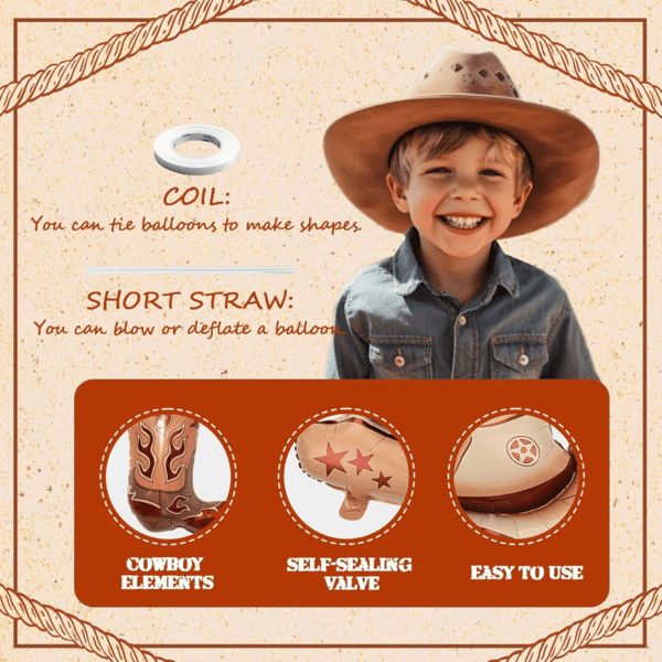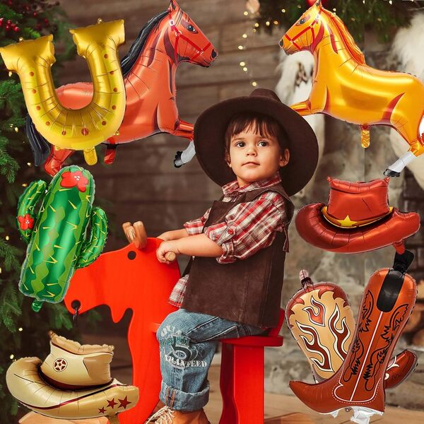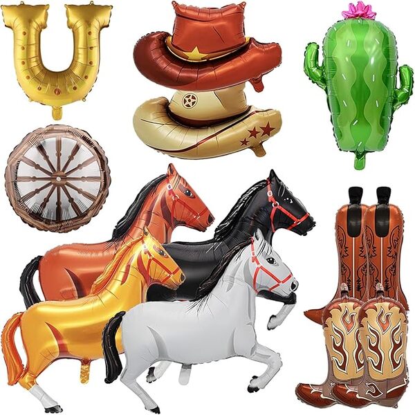 Набір гірлянд із фольгованих повітряних куль у формі ковбоя:Головною особливістю цього набору гірлянд з повітряних куль є повітряні кульки з фольги, що скачуть коні, що ширяють у повітрі. Ви можете закріпити їх точковим клеєм і стрічкою, щоб створити цей ефект. Крім того, хорошим поєднанням стануть фольговані повітряні кульки з ковбойськими капелюхами та фольговані повітряні кульки з ковбойськими чоботями. Основний корпус набору складається з латексних повітряних куль із дизайном у західному стилі. Існує приблизно 60-80 шт. повітряних куль різного розміру, включаючи коричневі, чорні, чорно-білі коров’ячого кольору тощо.