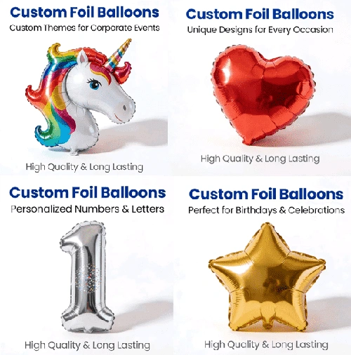 Індивідуальні фольговані кулі можна налаштувати в звичайних розмірах, включаючи 5, 10, 18, 24 і 36 дюймів. Спеціальні неправильні форми та розміри також можна налаштувати відповідно до вимог.