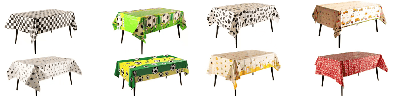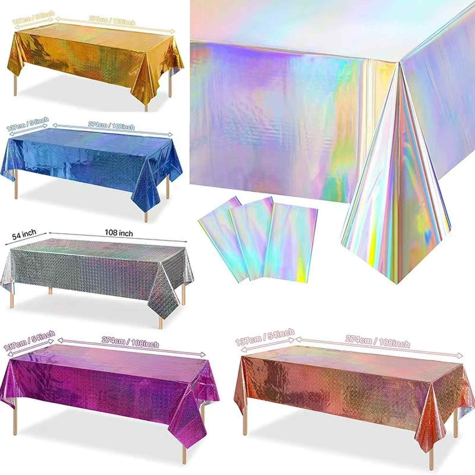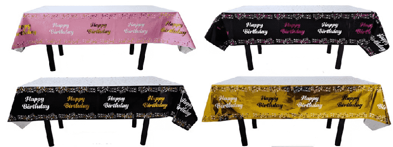 колір веселки, скатертина з фольги з мультяшними звірятками та візерунками на торті, підходить для дитячих днів народжень; золотий, сріблястий, лазерний колір із зірками та літерними візерунками, підходить для святкування днів народження для дорослих, святкування ювілеїв, вечірок для подружок тощо, можна розставляти на сімейних обідніх столах, столах для вечірок у готелі, столиках для пікніка на відкритому повітрі та інших сценах.