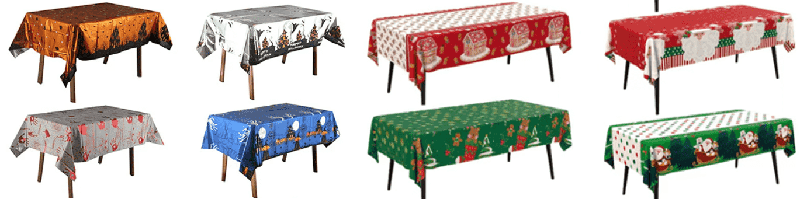 Наприклад, поєднання червоного та зеленого кольорів у темі Різдва, скатертини з фольги з візерунком ялинки та сніжинки, поєднання чорного та помаранчевого кольорів на тему Хеллоуїна з візерунком гарбуза та кажана, а також поєднання червоного та золотого кольорів на тему Весняного фестивалю з щасливими персонажами та візерунком ліхтариків можна використовувати для святкового оформлення стільниці будинків, торгових центрів, барів, ресторанів та інших місць.