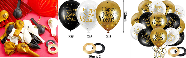 Латексні кулі на новорічні теми — це декоративні повітряні кулі, які доступні в наборах із новорічним дизайном, наприклад «З Новим роком», або святковими кольорами, як-от чорний, золотий і сріблястий. Вони ідеально підходять для вечірок, їх можна використовувати для створення арок з повітряних куль, букетів або підвішувати до стелі. Усі новорічні латексні кулі, які пропонує Фабрика повітряних куль Borun, повністю виготовлені з латексу та відповідають сертифікації Happy New Party Latex Balloons CE. Бренд niun підтримує оптові продажі латексних повітряних куль на новорічні мотиви. Ці латексні кулі з новим роком є практичними та естетично привабливими, а також пропонують економічний та креативний дизайн. Вони миттєво піднімають святкову атмосферу і привносять тепло і радість у будь-яке свято.