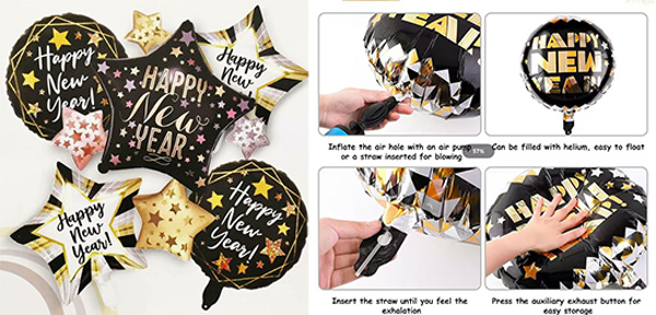 Повітряні кулі з новорічною тематикою є обов’язковою частиною святкового декору. Ці яскраві повітряні кульки чорного та золотого кольору створюють неповторний святковий штрих, привносячи радість та стиль у новорічну атмосферу. Їх міцна текстура протистоїть дефляції, що дозволяє їм залишатися ситими протягом тривалого часу. Їх можна надувати за допомогоюгелієм або повітрям, зберігаючи повний тривимірний вигляд. Вони ідеально підходять як для внутрішньої, так і для зовнішньої обробки.