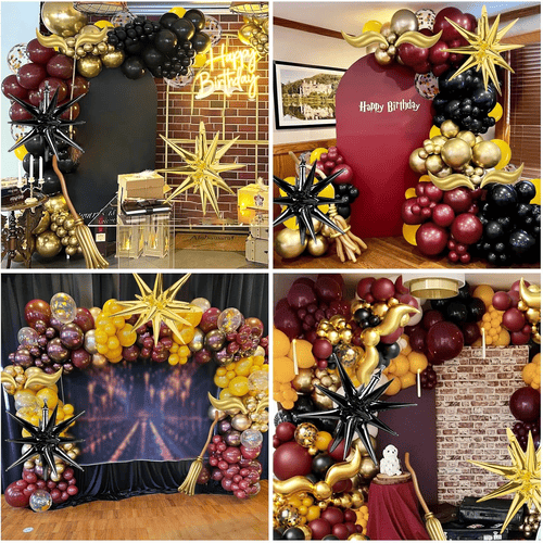 Латексна повітряна куля в арці повітряної кулі на тему Гаррі Поттера виготовлена зі 100% сирого латексу, який імпортується з Південно-Східної Азії. Оскільки це натуральний матеріал, вони абсолютно екологічні та нешкідливі для дітей і дорослих. Їх кольори є символічними кольорами фільмів про Гаррі Поттера, включаючи винний червоний, жовтий, чорний і золотий. Щоб додати більше шарів, ми також додали повітряну кульку конфетті, конфетті металевого золота.