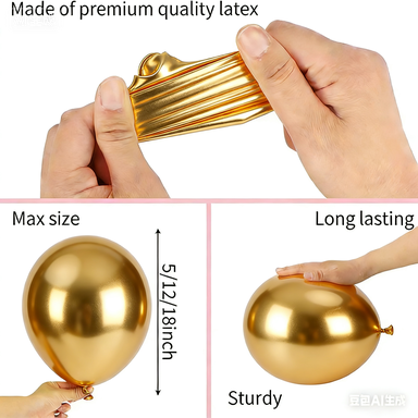 Латексні кулі, які ми надаємо для отвору в одному наборі гірлянд для повітряних куль, виготовлені зі 100% натурального латексу, імпортованого з Південно-Східної Азії. Вони мають розміри 5 дюймів, 10 дюймів, 12 дюймів і 18 дюймів, розташувавши їх у різних розмірах, можна створити привабливий ефект шарування.