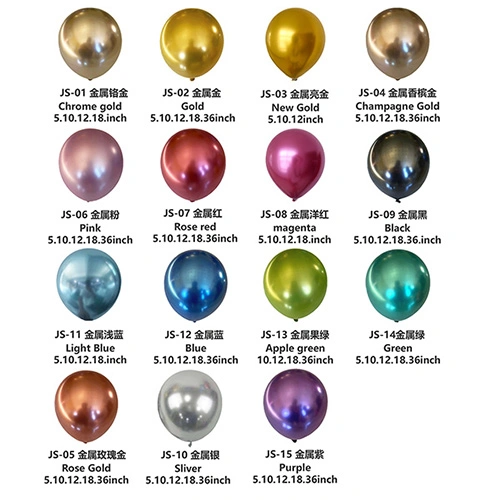 Металеві повітряні кулі:Завдяки глянсовій дзеркальній обробці та привабливим текстурам і кольорам, це найбільш універсальні латексні повітряні кулі для використання в декораціях вечірок, індивідуальному друку тощо.