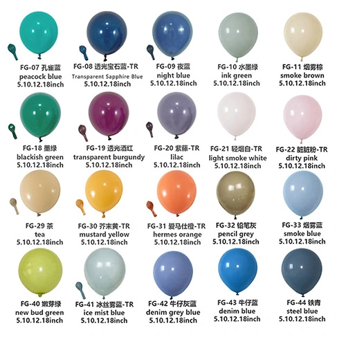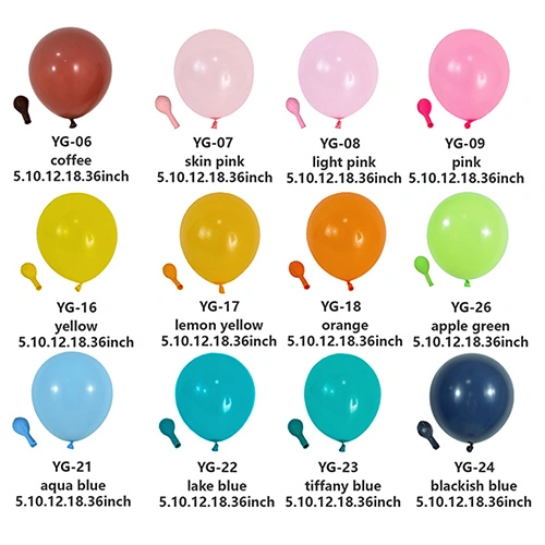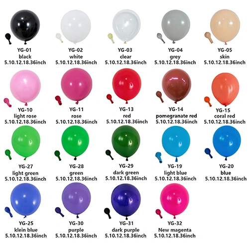 Наші латексні повітряні кулі зазвичай виготовляються у розмірах 5 дюймів, 10 дюймів, 12 дюймів, 18 дюймів і 36 дюймів. Якщо у вас є якісь особливі вимоги та вам потрібно налаштувати повітряні кулі, ми також можемо організувати виробництво інших розмірів.