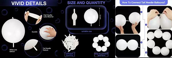 Наші кулі швидкого зв’язку виділяються з їх унікальним дизайном кінця до кінця, усуваючи потребу в інструментах. Порівняно з традиційними повітряними кулями, процес розширеного зв’язку з повітряною кулею простіший і швидший, що дозволяє ефективніше прикрасити свою вечірку чи місце проведення подій.