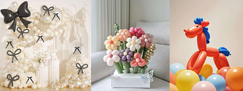 Повітряна куля можна використовувати поодинці, щоб показати свій стиль. Частина хвоста змушує повітряні кулі зв’язуватися між собою. Він може побудувати стіну повітряної кулі, повітряну кулю, 3D серця, будувати торти тощо. Форми можуть бути складними.