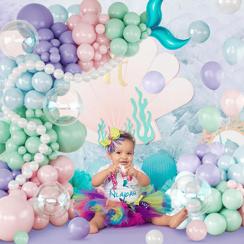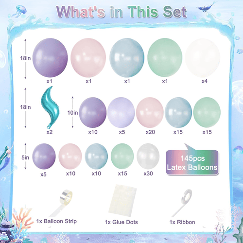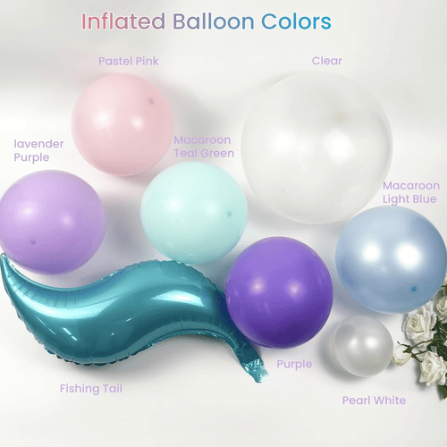 Повітряні кулі в гірлянді з повітряних куль Mermaid поставляються в різних кольорах, таких як фіолетовий, лавандовий, пастельно-рожевий, світло-блакитний, темно-зелений, перламутрово-білий і прозорий, а також прикраси з хвоста русалки з фольги, що робить його чудовим для створення чарівної вечірки на тему океану русалки.