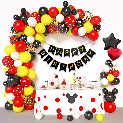 ЦеАрка гірлянди повітряної кулі Міккі Маусав основному випускається в рожевій і червоній серії, в т.члатексні повітряні кулі, фольговані кулі, паперові банери на день народження, штори з фольги та інші аксесуари. Всі аксесуари цього пакету якісні.