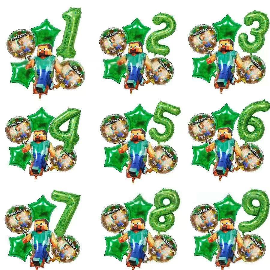 Повітряні кулі з фольги Minecraft надихаються піксельними візерунками трави та шарів бруду в грі. Вони поставляються в зелених формах числа, що охоплюють 1 - 9. Піксельна текстура на цифрах копіює стиль гри. З'єднайте їх із відповідними трав’яними блоками та зірковими кулями. Віковий дисплей також має вигляд Minecraft. Вони є цікавою родзинкою для вечірок на день народження.