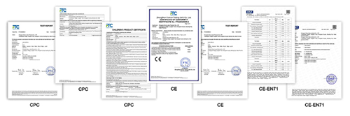 Весь асортимент нашої продукції пройшов сертифікацію CPC, CE, EN71 та інші авторитетні сертифікації відповідно до європейських, американських та інших цільових ринкових правил безпеки. Ці кваліфікації можуть допомогти вашим товарам легко пройти митне очищення та повністю уникнути ризиків недотримання вимог на закордонних ринках.